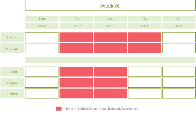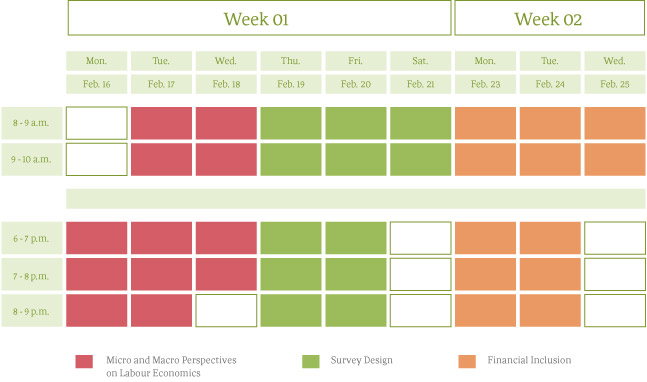 Classes will follow the schedule below. Admitted participants will also receive details about a special post-course event. Participation in this event is optional and not included in the tuition fee.